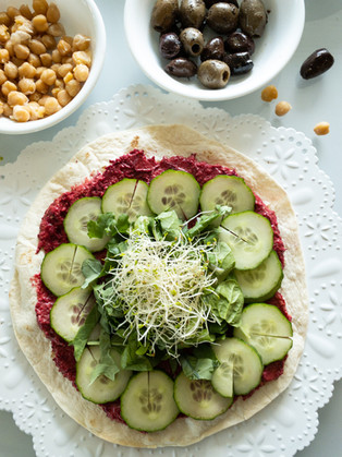 once cool, spread a layer of beet hummus, then pile the baby spinach in the center, top it up with alfalfa sprouts. Subsequently, arrange thinly sliced cucumbers, olives, cherry tomatoes, boiled garbanzo beans around it.
